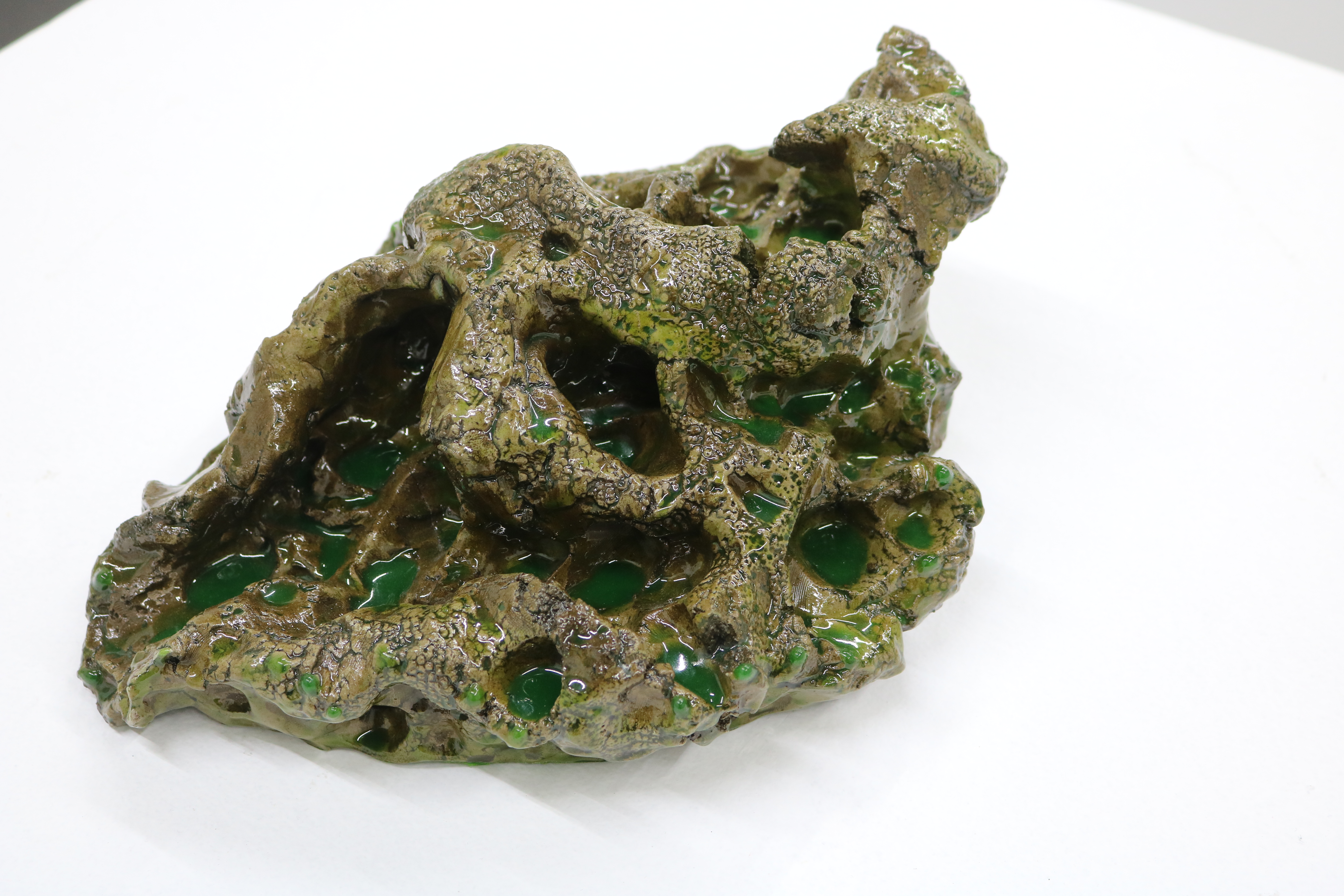 Landarin utiliza barro, porcelana fria e resina para dar concretude à esculturas que parecem florescer do salino encontro das águas do mar catarinense (seu ponto de partida) com a baía da Guanabara.